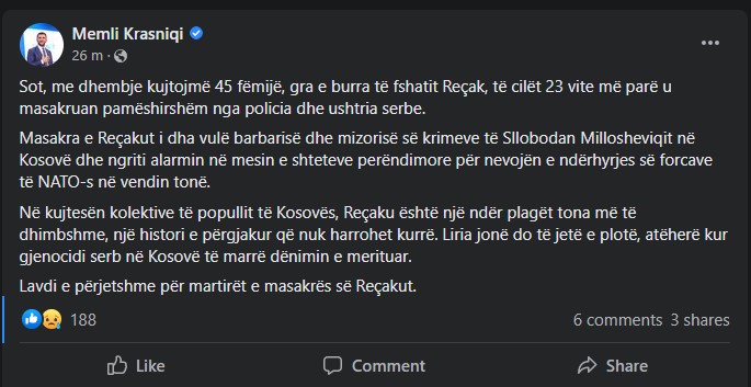“Liria jonë do të jetë e plotë, atëherë kur gjenocidi serb në Kosovë të marrë dënimin e merituar. Lavdi e përjetshme për martirët e masakrës së Reçakut”, ka shkruar tutje Krasniqi./arbresh.info/