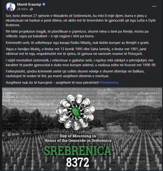Kryetari i Partisë Demokratike së Kosovës, Memli Krasniqi përmes një shkrimi në facebook, ka kujtuar 27 vjetorin e Masakrës së Srebrenicës.