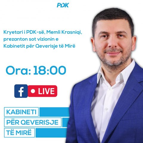 Kryetari i Partisë Demokratike të Kosovës, Memli Krasniqi, nëpërmjet një video-adresimi prezanton sot, nga ora 18:00, vizionin e Kabinetit për Qeverisje të Mirë.