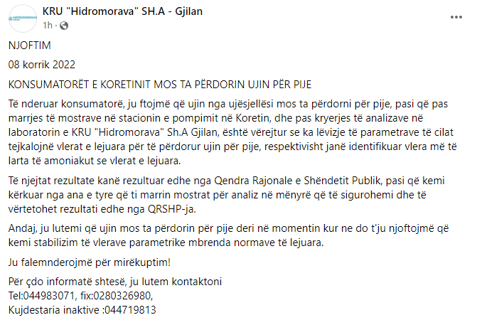 Sipas njoftimit në Facebook, amoniaku ka rezultuar të jetë në sasi të larta pasi që pas marrjes së mostrave në stacionin e pompimit në Koretin, dhe pas kryerjes të analizave në laboratorin e KRU “Hidromorava” Sh.A Gjilan, është vërejtur se ka lëvizje të parametrave të cilat tejkalojnë vlerat e lejuara për të përdorur ujin për pije.