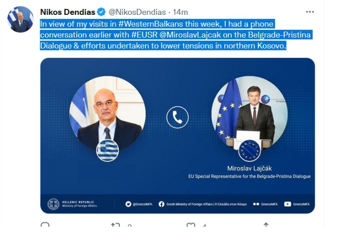 “Në funksion të vizitave të mia në Ballkanin Perëndimor, më parë pata një bisedë telefonike me Miroslav Lajcak, më të cilën fola mbi dialogun Beograd-Prishtinë dhe përpjekjet e ndërmarra për uljen e tensioneve në veri të Kosovës”, ka shkruar kryediplomati grek në Twitter, raporton RTKlive.