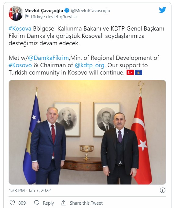 Ministri i Punëve të Jashtme i Turqisë, Mevlut Çavusoglu, ka pritur në takim ministrin për Zhvillim Rajonal në qeverinë e Kosovës, Fikrim Damka, njëherësh edhe kryetari i Partisë Demokratike Turke të Kosovës (KDTP).