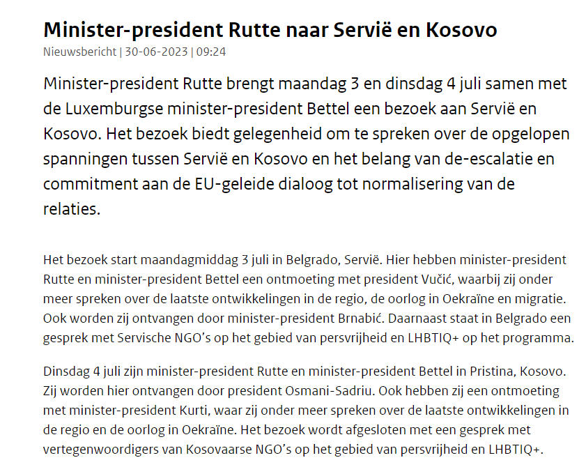 “Kryeministri Rutte do të vizitojë Serbinë dhe Kosovën të hënën më 3 korrik dhe të martën më 4 korrik së bashku me kryeministrin e Luksemburgut, (Xavier) Bettel”, shkruan në këtë njoftim.