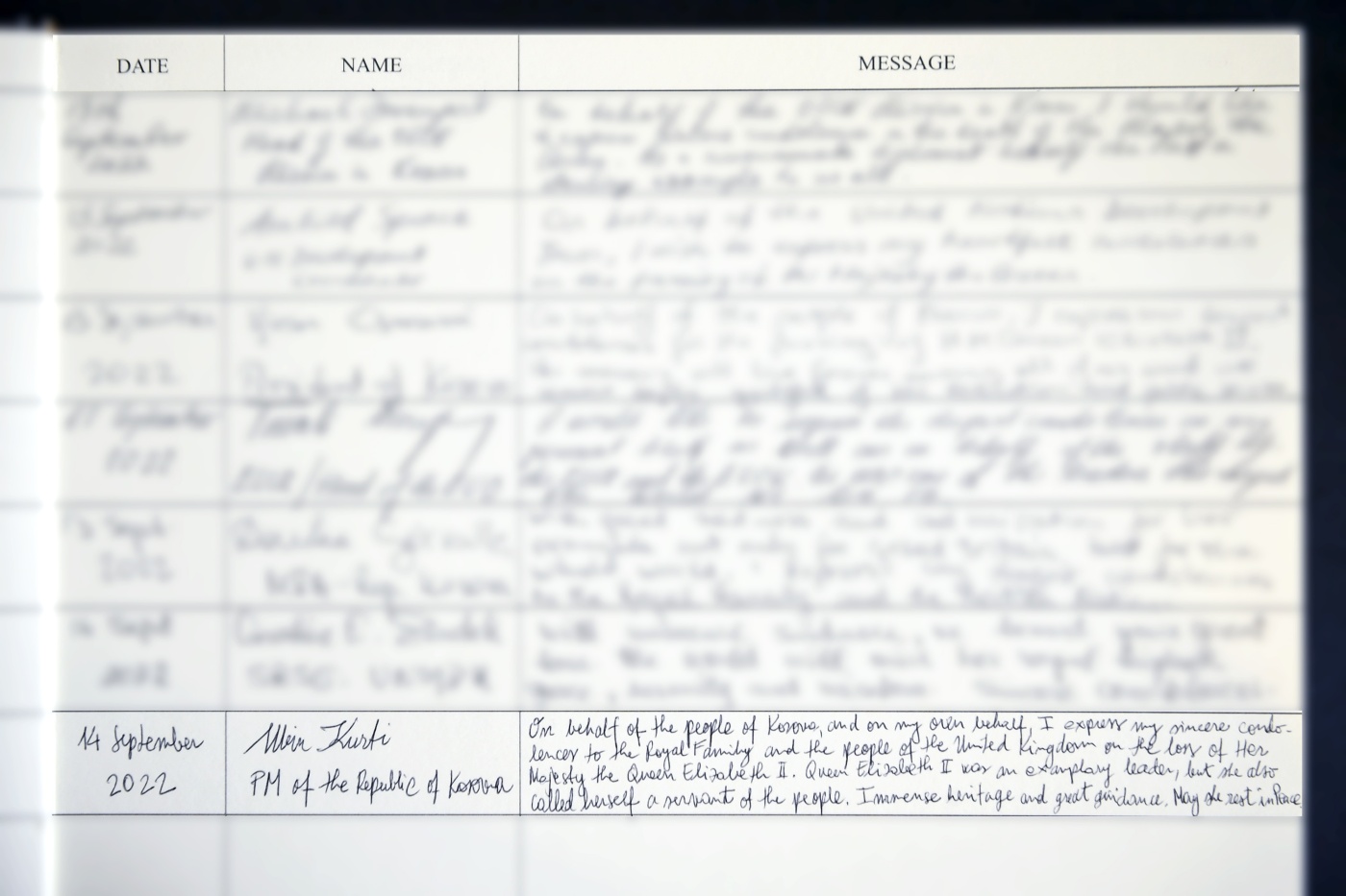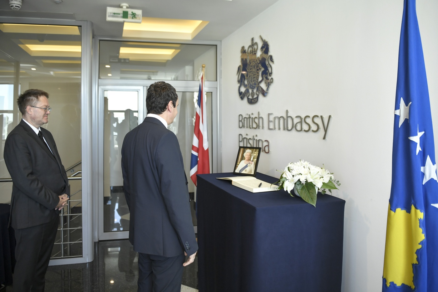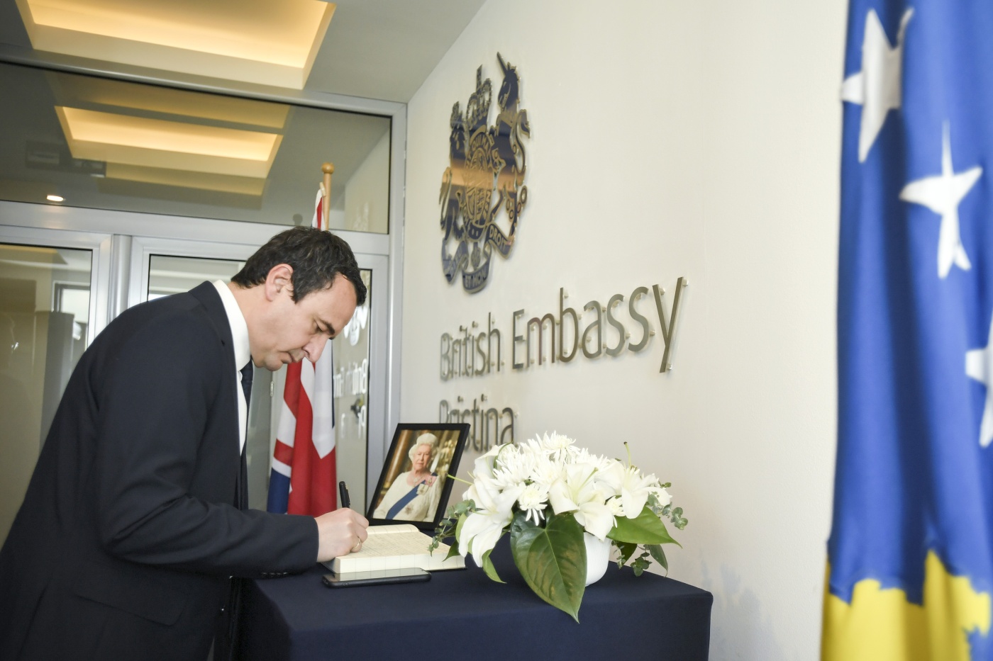 Në librin e zisë, të hapur në Ambasadën e Britanisë së Madhe në Kosovë, Kryeministri i Republikës së Kosovës, Albin Kurti, ka shprehur respektin dhe nderimin për lartmadhërinë e saj, Mbretëreshën Elizabeta II.