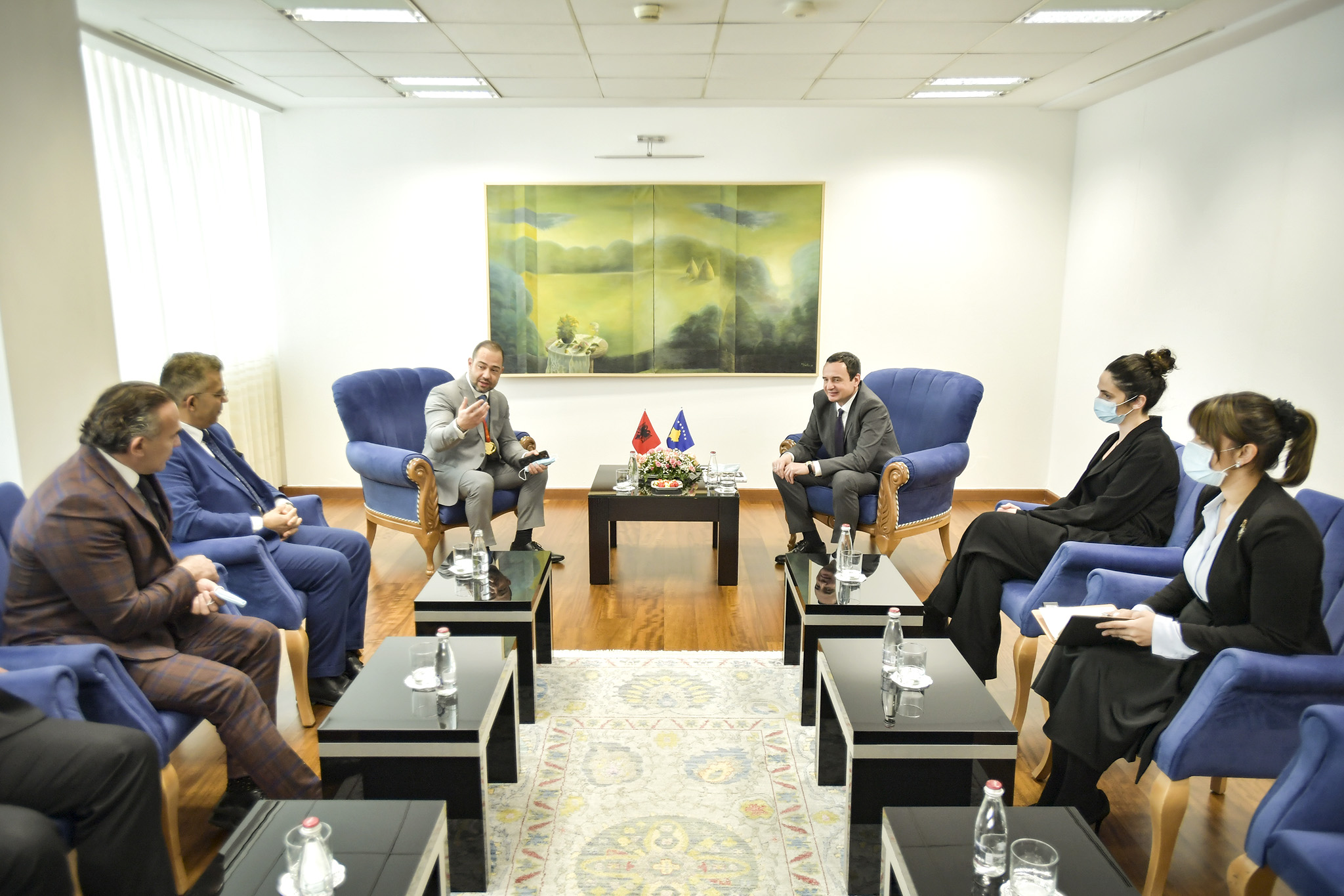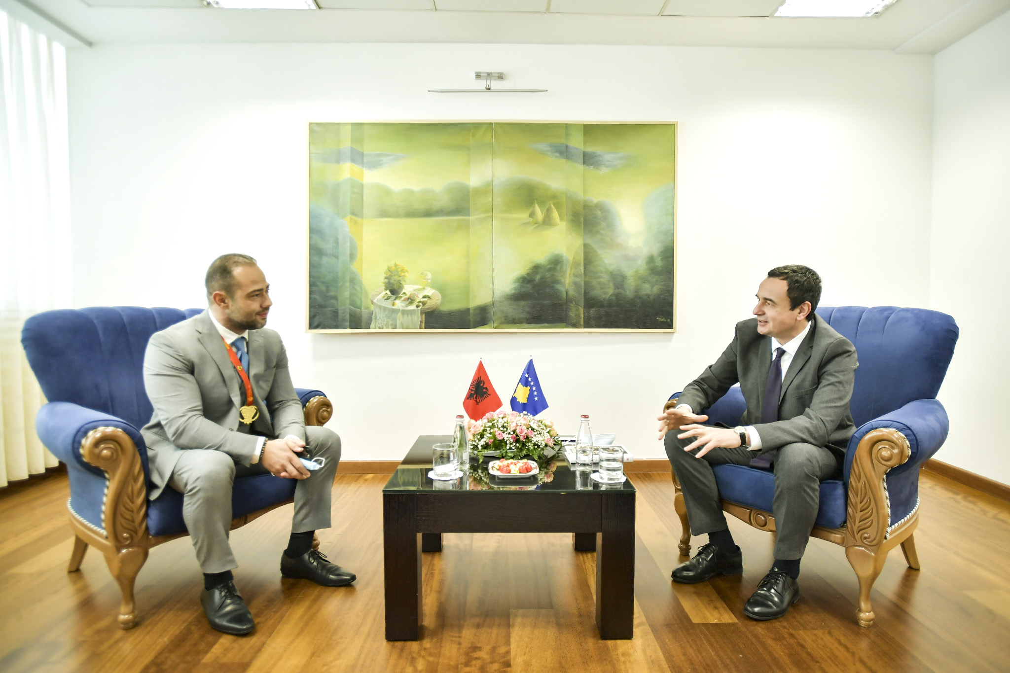 Kryeministri i Republikës së Kosovës, Albin Kurti, së bashku me Zëvendësministren e Kulturës, Rinisë dhe Sportit, Daulina Osmani, priti në takim Kampionin Absolut Mbarëkombëtar në Bodybuilding dhe Fitness, z.Marin Meksi, njëherit diplomat me përvojë në misione diplomatike të Republikës së Shqipërisë.