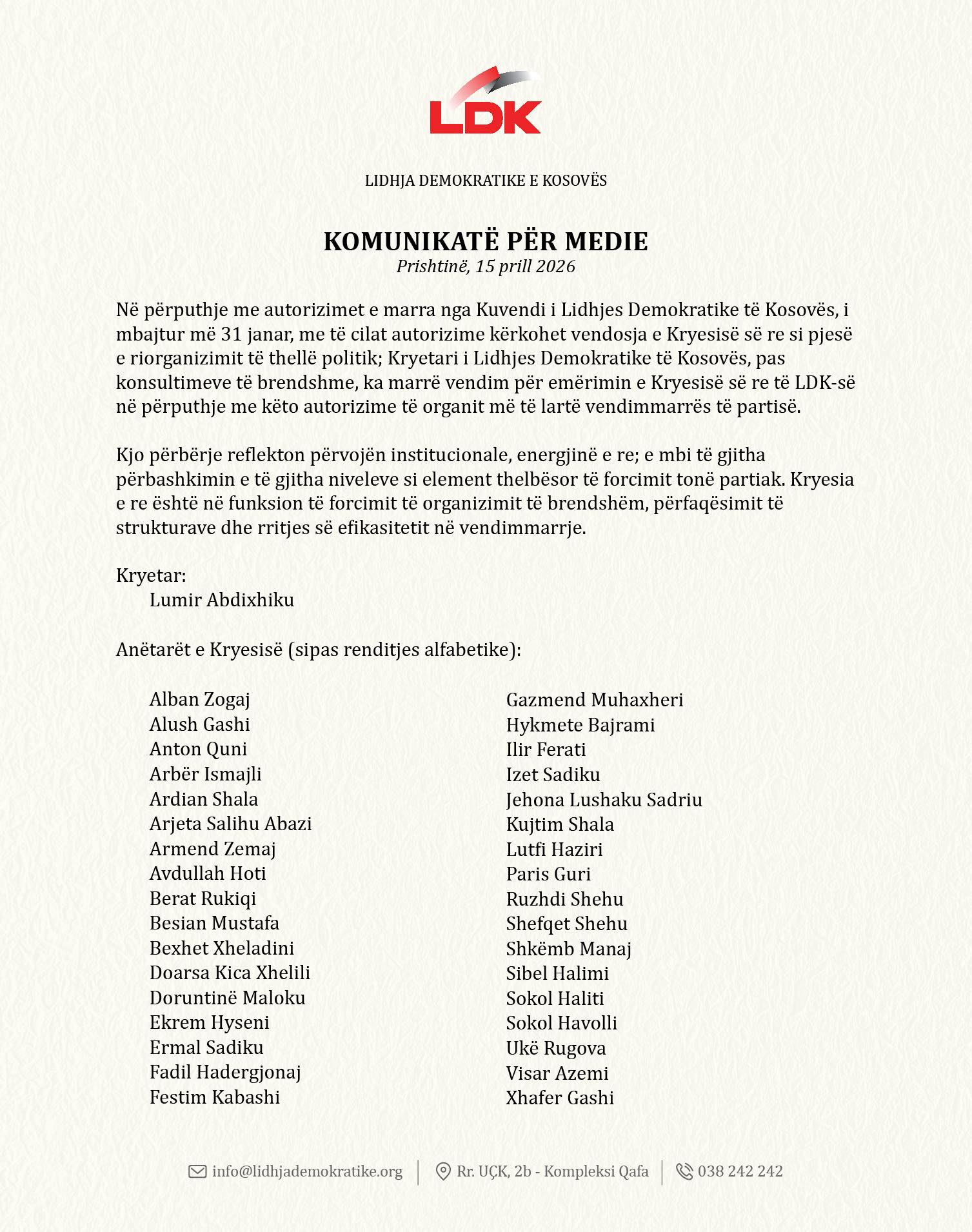 Sipas komunikatës për media, vendimi është marrë nga kryetari i partisë, Lumir Abdixhiku, në përputhje me autorizimet e dhëna nga Kuvendi i LDK-së, i mbajtur më 31 janar, shkruan gazeta online Reporteri.net.