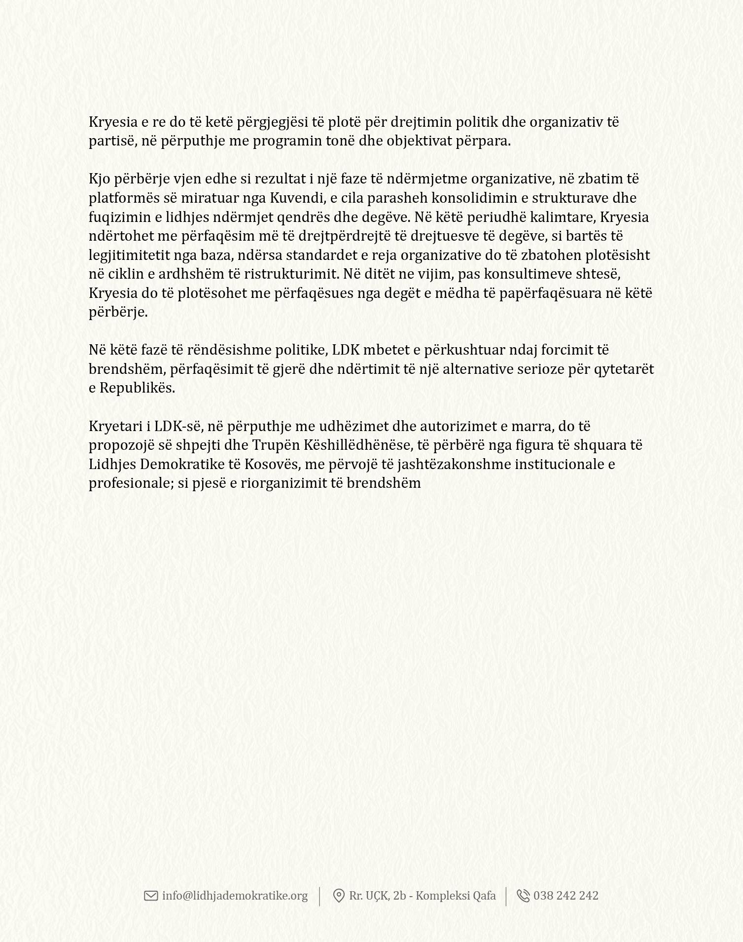 LDK-ja ka thënë se së shpejti do të plotësojë Kryesinë me përfaqësues të degëve të mëdha të papërfaqësuara dhe do të propozojë së shpejti edhe Trupën Këshilldhënëse, si pjesë të organizimit të brendshëm.
