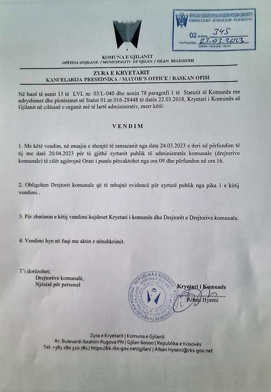 Kryetari i Komunës së Gjilanit, Alban Hyseni ka nxjerrë vendim që për muajin e ramazanit, të gjithë zyrtarët që agjërojnë të punojnë një orë më pak.