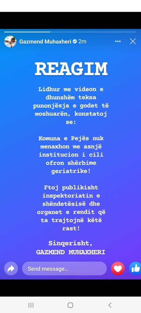 Kryetari i Pejës, Gazmend Muhaxheri ka reaguar ashpër ndaj rastit ku në një shtëpi të pleqve në këtë komunë e moshuara sulmohet fizikisht nga dy infermiere.