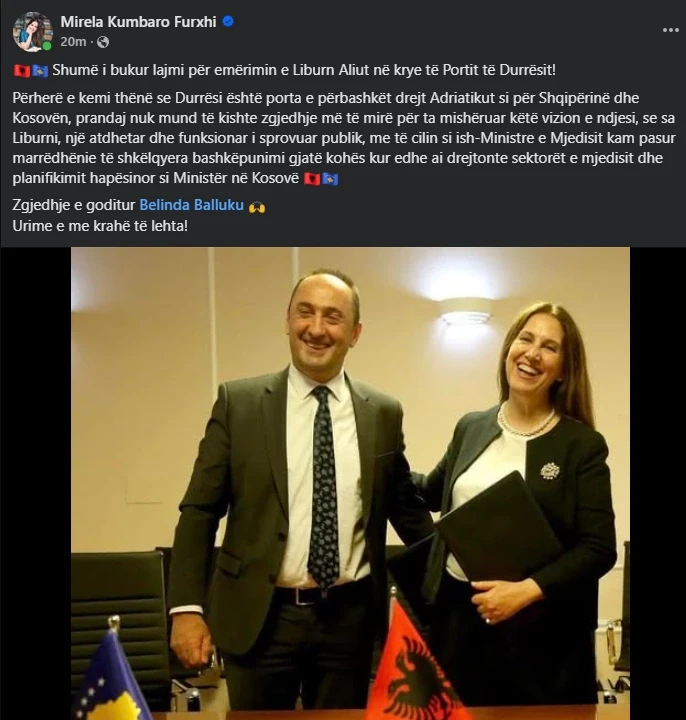 “Shumë i bukur lajmi për emërimin e Liburn Aliut në krye të Portit të Durrësit! Përherë e kemi thënë se Durrësi është porta e përbashkët drejt Adriatikut si për Shqipërinë dhe Kosovën, prandaj nuk mund të kishte zgjedhje më të mirë për ta mishëruar këtë vizion e ndjesi, se sa Liburni, një atdhetar dhe funksionar i sprovuar publik, me të cilin si ish-Ministre e Mjedisit kam pasur marrëdhënie të shkëlqyera bashkëpunimi gjatë kohës kur edhe ai drejtonte sektorët e mjedisit dhe planifikimit hapësinor si Ministër në Kosovë Zgjedhje e goditur Belinda Balluku Urime e me krahë të lehta!”, ka shkruar ajo./Arbresh.info/