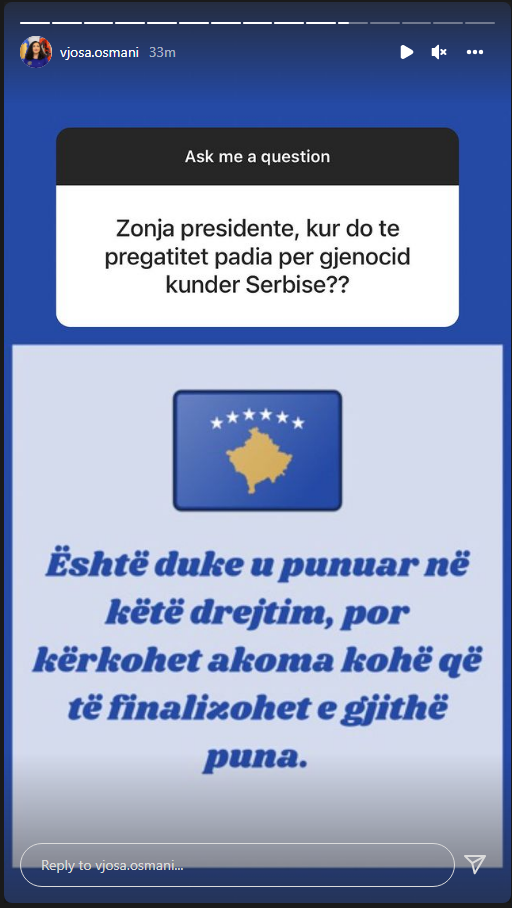 Për këtë, presidentja e Republikës së Kosovës, Vjosa Osmani, i është përgjigjur pyetjeve të ndjekëseve të saj në Instagram duke shkruar se është duke u punuar në këtë drejtim, ndërsa ka bërë të ditur se duhet kohë që të finalizohet e gjithë puna, përcjell arbresh.info.