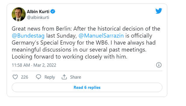 “Lajm i mirë nga Berlini: Pas vendimit historik të Bundestagut të dielën e fundit, Manuel Sarrazin është zyrtarisht i dërguari special i Gjermanisë për Ballkanin Perëndimor. Unë kam pasur gjithmonë diskutime domethënëse në disa takime të kaluara tona. Mezi pres të punoj ngushtë me të”, ka shkruar Kurti në Twitter.