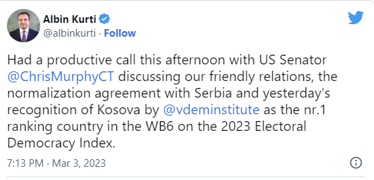 “Pata një telefonatë produktive me senatorin Chris Murphy, ku diskutuam për marrëdhëniet tona miqësore, marrëveshjen e normalizimit me Serbinë dhe renditjen e djeshme të Kosovës nga Instituti V-Dem si vendi i parë në Ballkan në Indeksin e Demokracisë Zgjedhore 2023”, shkroi Kurti në Twitter./arbresh.info/