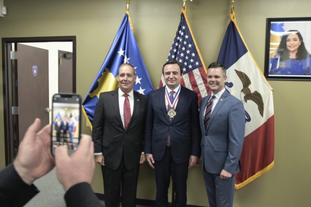 “Me kërkesë të senatorit nga Qarku Polk, Zach Nunn, Senati njeh dhe dekoron Kryeministrin Albin Kurti, me medaljen e Shërbimit të Jashtëm të Shquar të Ioëas. Kjo dekoratë, e projektuar nga senatori Zach Nunn, është një kryq maltez për qëndrueshmërinë e karakterit, e zbukuruar me stemën e shtetit të Ioëas dhe e shënjuar me pikën referuese të Ioëas, Kapitolin, që simbolizon përkushtimin ndaj shërbimit.