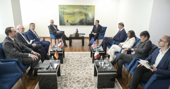 Kryeministri në detyrë Albin Kurti, i shoqëruar nga zëvendëskryeministri në detyrë, Besnik Bislimi dhe zëvendësministri në detyrë i Punëve të Jashtme dhe Diasporës, Kreshnik Ahmeti, mirëpriti sot ambasadorët dhe përfaqësuesit diplomatik të shteteve të QUINT-it dhe Shefin e Zyrës së Bashkimit Evropian në Kosovë. Zyra e Kryeministrit njofton se temë qendrore e takimit ishte procesi … Continue reading Kurti diskuton për anëtarësimin e Kosovës në KiE me ambasadorët e vendeve të Quint-it