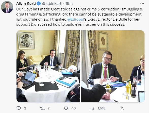 Qeveria jonë ka bërë përparime të mëdha kundër krimit dhe korrupsionit, kontrabandës, kultivimit dhe trafikimit të drogës, sepse nuk mund të ketë zhvillim të qëndrueshëm, pa sundimin e ligjit. Falenderova Drejtoreshën Ekzekutive të Europolit, De Bolle, për mbështetjen e saj dhe diskutuam se si të ndërtohet edhe më tej ky sukses” ka shkruar Kurti në Twitter. /arbresh.info/