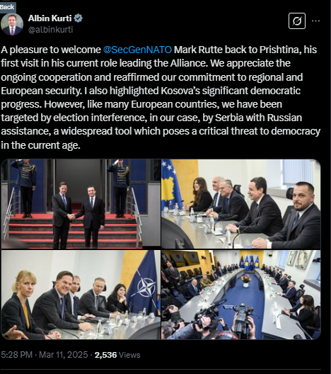 Pas takimit, Kurti nëpërmjet një postimi në “X”, ku ka theksuar se Serbia, me mbështetje nga Rusia, ka ndërhyrë në zgjedhjet e 9 shkurtit në Kosovë.