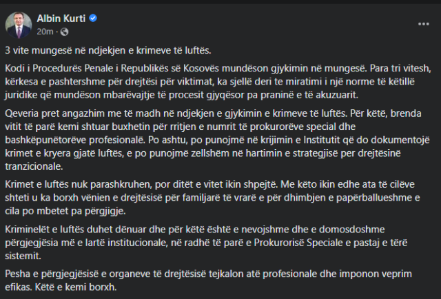 Kurti thotë në një status në Facebook se për tri vitet e fundit ka pasur mungesë në ndjekjen e krimeve të luftës.