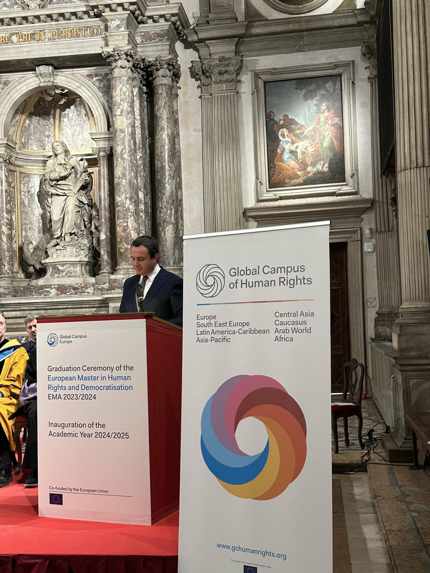 Kryeministri i Republikës së Kosovës, Albin Kurti, mori pjesë dje në ceremoninë e diplomimit të programit evropian të masterit për të Drejtat e Njeriut dhe Demokratizim (EMA), ku ishte i ftuar si folës kyç.