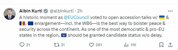 “Një moment historik votimi i Këshillit të BE-së për hapjen e bisedimeve të anëtarësimit me Ukrainën dhe Andorrën. WB6-është mënyra më e mirë për të forcuar paqen dhe sigurinë në të gjithë kontinentin. Si një nga shtetet më demokratike dhe pro-BE në rajon, Kosovës duhet t’i jepet statusi i kandidatit pa vonesë”, ka shkruar Kurti.