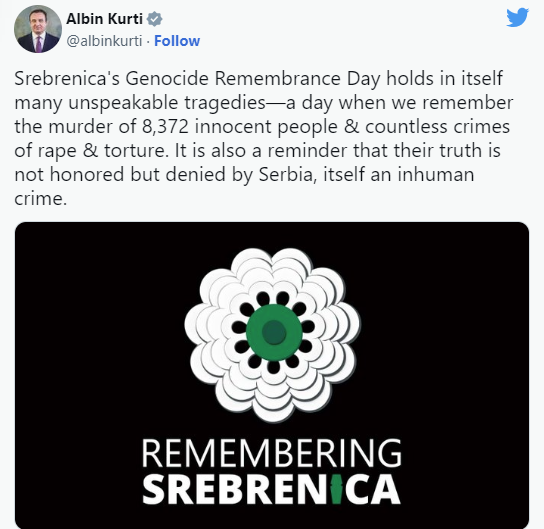 “Dita e Përkujtimit të Gjenocidit të Srebrenicës mban në vetvete shumë tragjedi të pa treguara – një ditë kur kujtojmë vrasjen e 8,372 njerëzve të pafajshëm dhe krimet e panumërta të përdhunimeve dhe torturave. Është gjithashtu një kujtesë se e vërteta e tyre nuk nderohet por mohohet nga Serbia, një krim çnjerëzor në vetvete”, ka shkruar Kurti në Twitter./Arbresh.info/