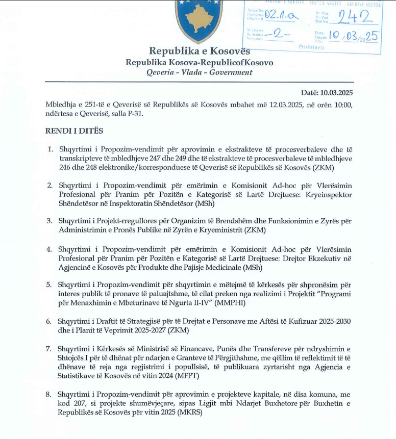 Qeveria e Kosovës sot do të mbaj mbledhjen e 251-të me radhë.