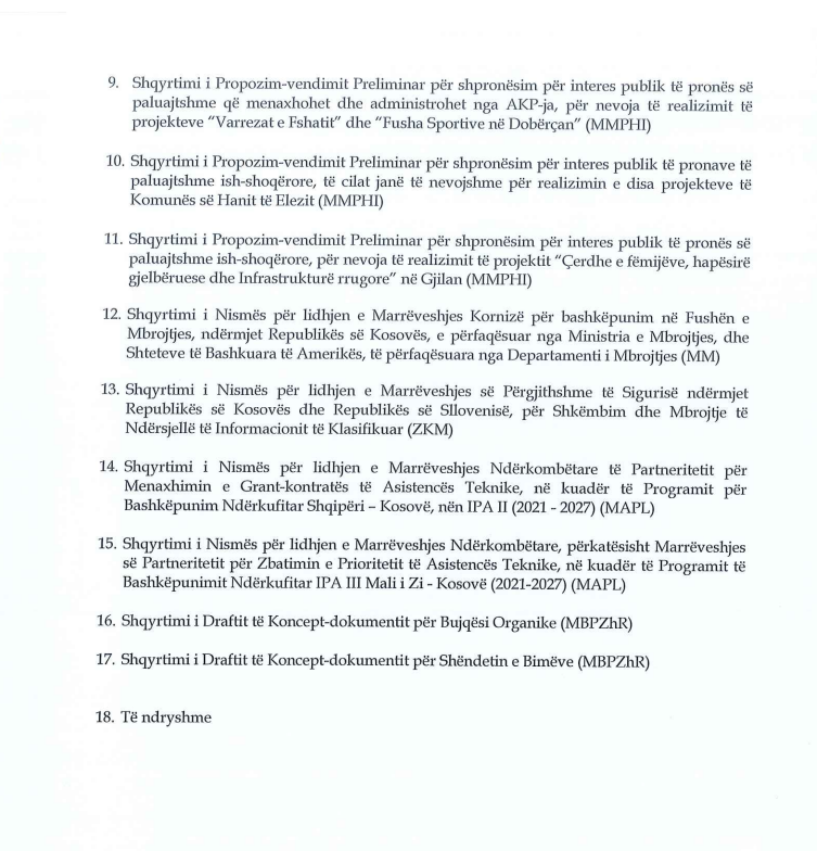 Në rend të ditës është edhe shqyrtimi i nismën për lidhjen e Marrëveshjes Kornizë për bashkëpunim në fushën e Mbrojtjes ndërmjet Republikës së Kosovës dhe Shteteve të Bashkuara të Amerikës, të përfaqësuar nga Departamenti i Mbrojtjes, përcjell Arbresh.info