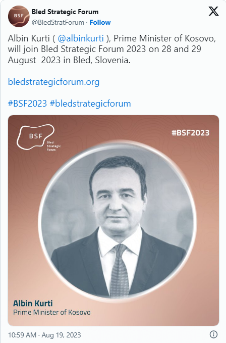 “Albin Kurti, kryeministër i Kosovës, do t’i bashkohet Forumit Strategjik të Bled më 28 dhe 29 gusht 2023 në Bled të Sllovenisë”, thuhet në njoftim./Arbresh.info/