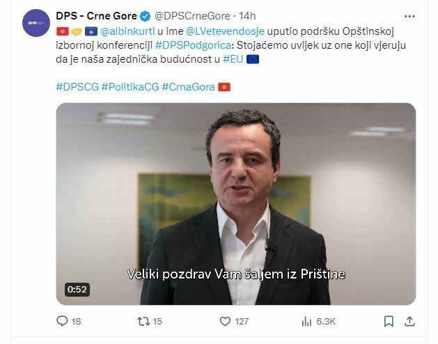 Kryeministri i Kosovës, Albin Kurti, në emër të Lëvizjes Vetëvendosje, të cilën ai drejton, ka dërguar një mesazh mbështetjeje për Partinë Demokratike të Socialistëve në Mal të Zi të cilën e ka themeluar Milo Gjukanoviq, para konferencës së tyre zgjedhore në Podgoricë, me mesazhin se ai gjithmonë do të qëndrojë pranë atyre që besojnë se e ardhmja e përbashkët e rajonit është në Bashkimin Evropian.