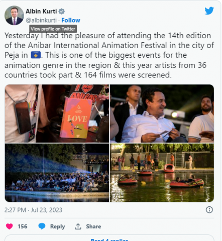 Kurti ishte i pranishëm në natën e pestë të këtij festivali, madje publiku në llogarinë e tij zyrtare në Tëitter disa fotografi nga festivali “Anibar”, ku theksoi se u ndje i kënaqur nga vizita./Arbresh.info/