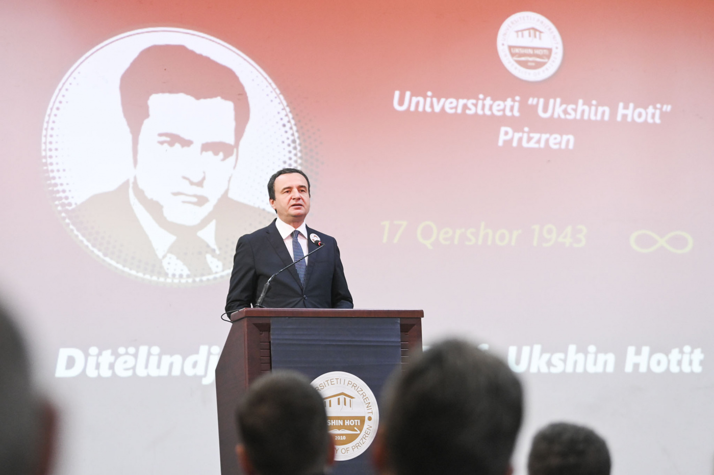 Kryeministri i Republikës së Kosovës, Albin Kurti, pas nderimit që ka bërë në shtëpinë Muze të Prof. Ukshin Hotit, ka marrë pjesë në ceremoninë e organizuar nga Universiteti “Ukshin Hoti”, në Prizren, në shënimin e 80- vjetorit të lindjes të tij.