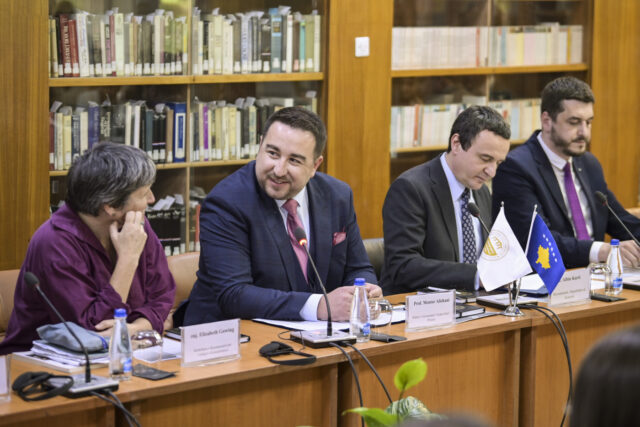 Kryeministri Kurti fillimisht zhvilloi një takim me Rektorin e Universitetit “Ukshin Hoti”, Mentor Alishani, ku edhe u njoftua për punën dhe të arriturat e këtij Universiteti, teksa u shpreh se është i lumtur që ndodhet në qytetin e lashtë të Prizrenit nga i cili kanë dalur shumë intelektualë e artistë. Aty ai veçoi edhe të ndjerin Kujtim Paçaku si një nga studentët e dalluar.