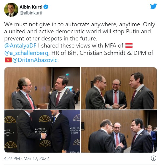 Kurti mori pjesë në ditën e dytë të Forumit të Diplomacisë në Antalia të Turqisë, pasi kishte anuluar pjesëmarrjen në ditën e parë me arsyetimin se është detyruar të qëndrojë në Prishtinë për të marrë masa pas situatës së krijuar nga rritja e çmimeve të produkteve bazike./arbresh.info/