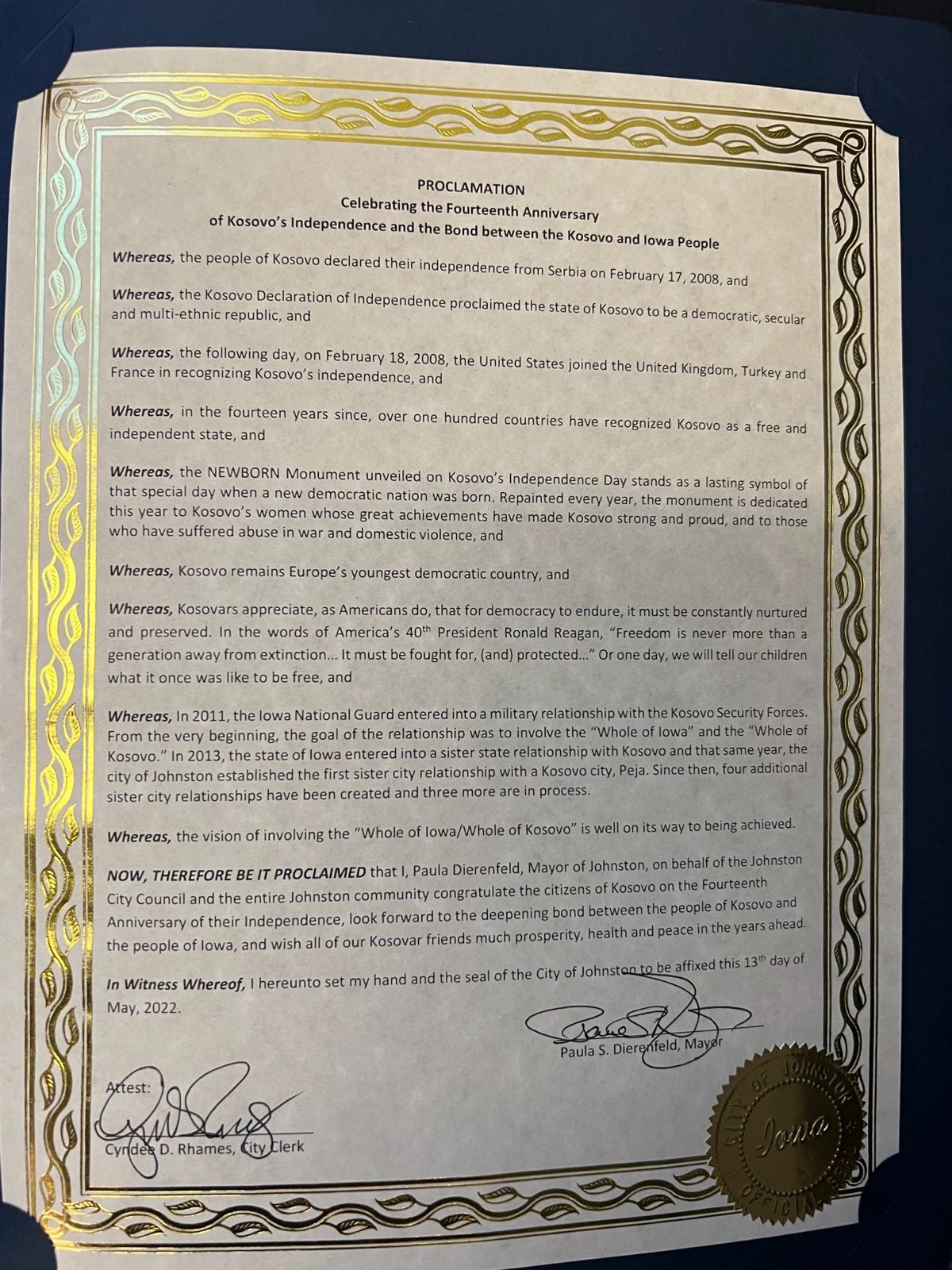 Në këtë pritje, në mesin e të cilëve ishin gjeneralët amerikanë Correl dhe Orr nga Garda Nacionale e Ioëa-s, shumë zyrtarë e përfaqësues institucionalë e politikë si dhe bashkatdhetarë tanë, kryeministri Kurti u nderua me një dhuratë përmes së cilës pranoi urimet e Kryetares Dierenfeld për 14-vjetorin e shpalljes së Pavarësisë së Republikës së Kosovës dhe lidhjen ndërmjet Kosovës dhe popullit të Iowa-s./arbresh.info/