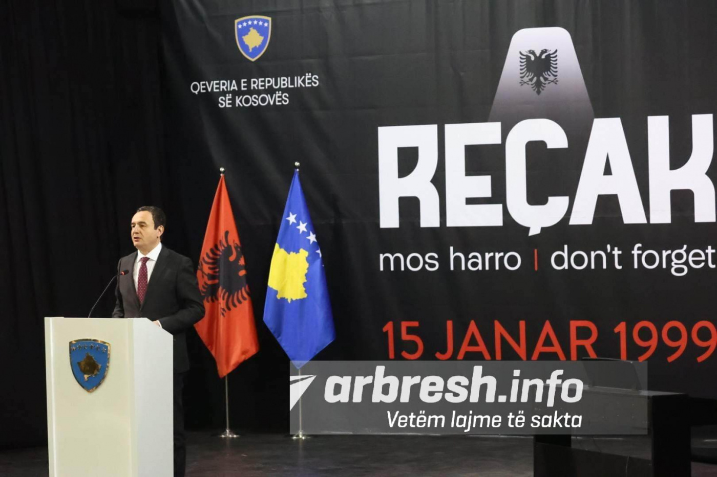 “Sot në 24-vjetorin e masakrimit të 45 shqiptarëve nga forcat e Serbisë në Reçak, teksa kujtojmë dhe nderojmë të gjitha viktimat e asaj kohe të errët, më lejoni që para jush, nga pozita e Kryeministrit të Republikës së Kosovës t’iu them që shteti ynë demokratik nuk i amniston kriminelët dhe nuk i harron krimet e luftës.