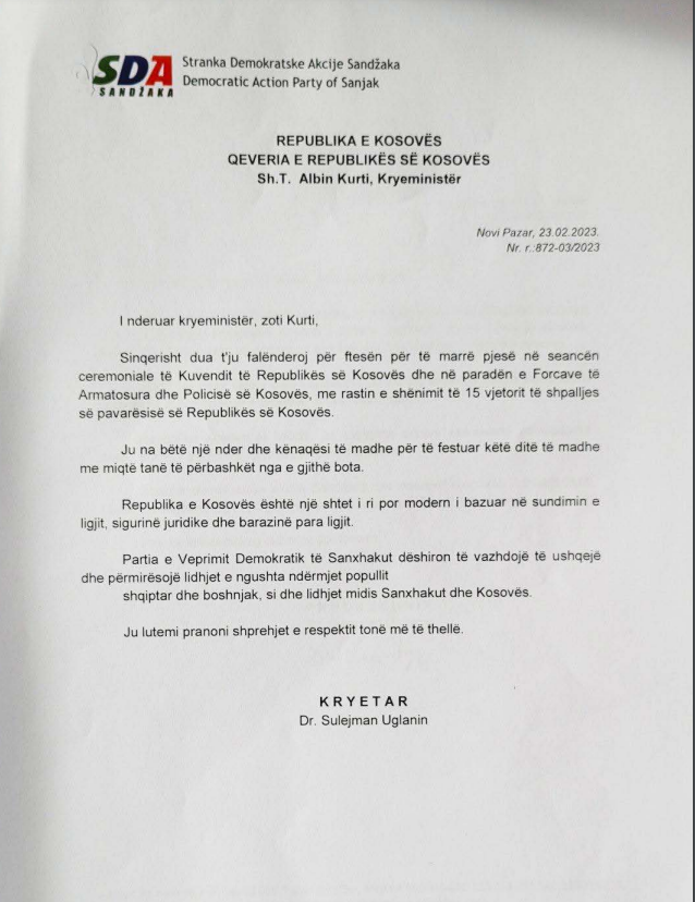 Kryeministri i Republikës së Kosovës, Albin Kurti, ka pranuar një letër falënderimi nga kryetari i Partisë për Veprim Demokratik të Sanxhakut, Sulejman Ugljanin për ftesën që i është bërë për të marrë pjesë në seancën ceremoniale të Kuvendit të Republikës së Kosovës, paradën e Forcave të Armatosura dhe Policisë së Kosovës me rastin e shënimit të 15-vjetorit të shpalljes së pavarësisë së Republikës së Kosovës.