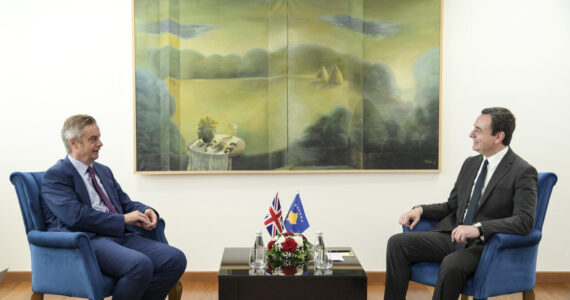 Kryeministri i Kosovës, Albin Kurti, priti në takim Ambasadorin e Mbretërisë së Bashkuar në Kosovë, Jonathan Hargreaves. Zyra e Kryeministrit njofton se ata kanë diskutuar për marrëdhëniet bilaterale, programet e bashkëpunimit dhe për zhvillimet në vend. “Kryeministri falënderoi ambasadorin Hargreaves për mbështetjen e Mbretërisë së Bashkuar për Doganën e Kosovës me pajisje teknike për luftimin … Continue reading Kurti pret në takim ambasadorin britanik, diskutojnë për marrëdhëniet bilaterale