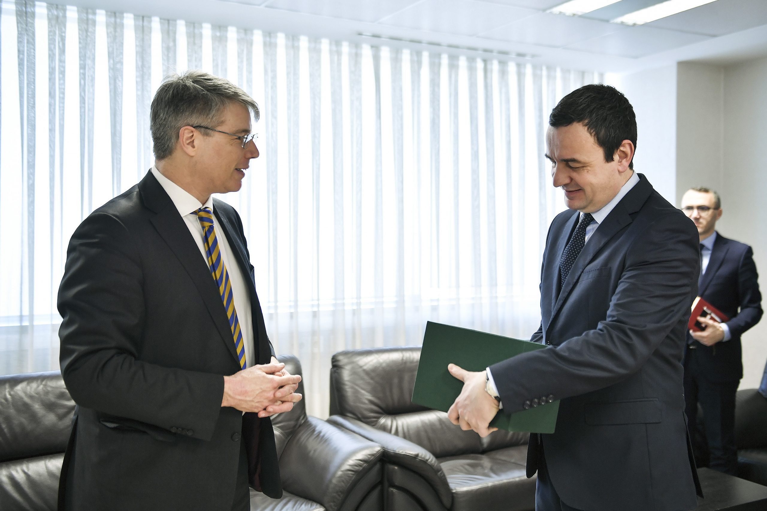 Schmitt i dhuroi kryeministrit Kurti librin e tij të fundit, përmbledhjen në pesë vëllime të korrespondencave të konsujve austriakë për Kosovën me titull “Politika dhe Shoqëria e Vilajetit të Kosovës”./arbresh.info/