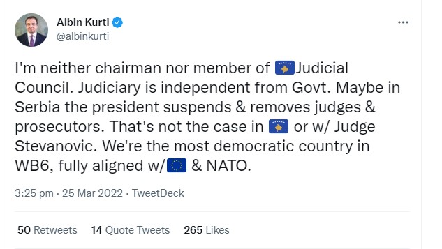 “Unë nuk jam as kryetar dhe as anëtar i Këshillit Gjyqësor të Kosovës. Gjyqësori është i pavarur nga Qeveria. Ndoshta në Serbi presidenti pezullon dhe largon gjyqtarët dhe prokurorët. Ky nuk është rasti në Kosovë ose me gjyqtaren Stevanoviç. Ne jemi vendi më demokratik në Ballkanin Perëndimor, plotësisht në linjë me BE-në dhe NATO-n”, ka shkruar Kurti.