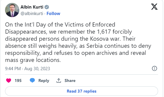 ”Në ditën ndërkombëtare të viktimave të zhdukjeve me forcë, kujtojmë 1617 personat e zhdukur me forcë gjatë luftës së Kosovës. Mungesa e tyre ende rëndon shumë, pasi Serbia vazhdon të mohojë përgjegjësinë dhe refuzon të hapë arkivat dhe të zbulojë vendndodhjet e varrezave masive”, ka shkruar Kurti./Arbresh.info/