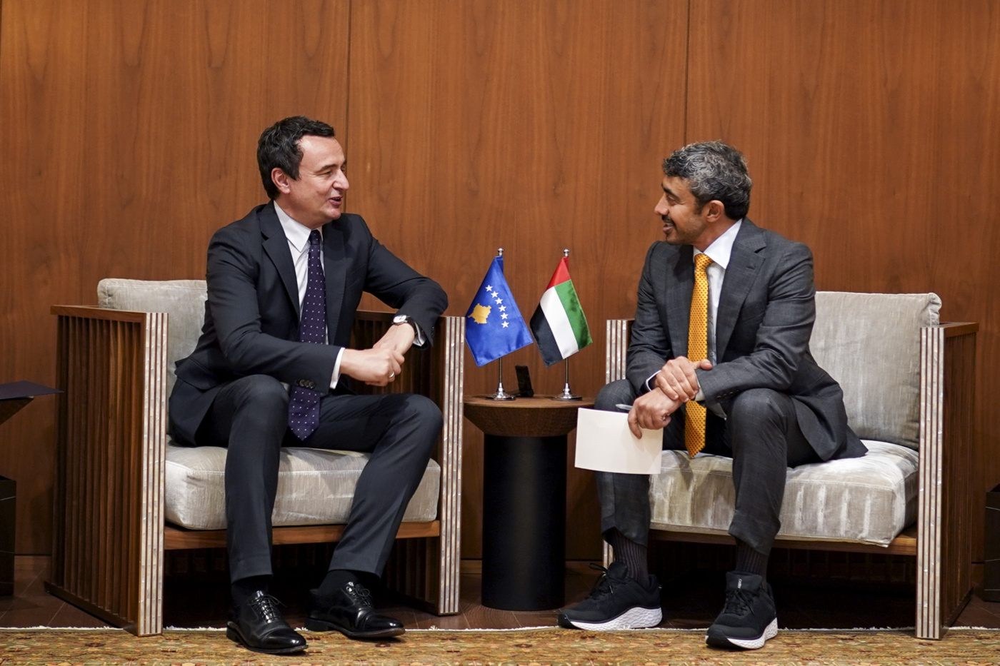 Përgjatë bashkëbisedimit, kryeministri Kurti i falënderoi Emiratet e Bashkuara Arabe për mbështetjen e vazhdueshme ndaj Kosovës. Diskutuan mbi fuqizimin e bashkëpunimit dhe rritjen e marrëdhënieve ekonomike mes dy vendeve. Kryeministri Kurti theksoi avantazhet që ofron Kosova si destinacion i përshtatshëm dhe i volitshëm për investime dhe ambientin e të bërit biznes, duke i ftuar kompanitë që të vijnë ta njohin më gjerë vendin tonë e të investojnë në fusha me interes të përbashkët.