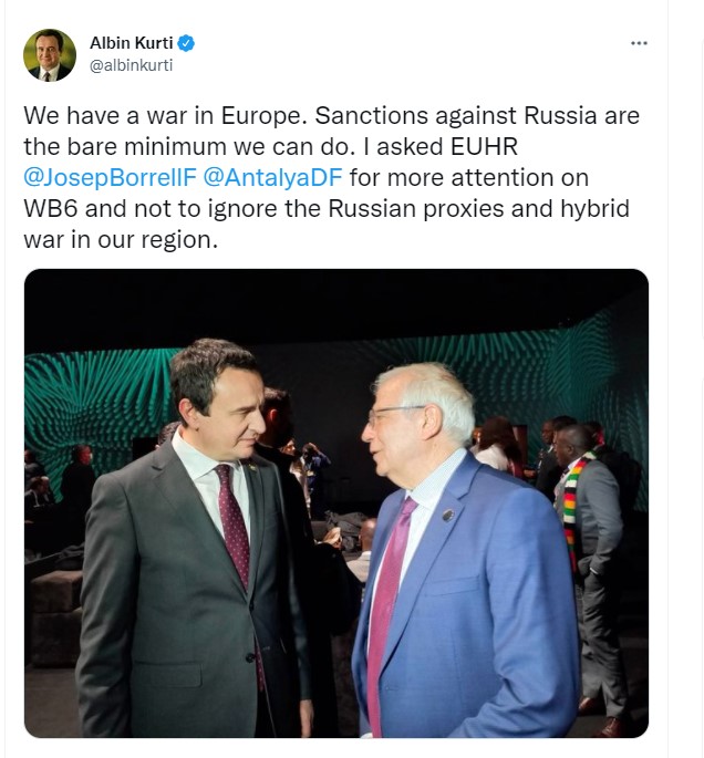 “Kërkova nga Përfaqësuesi i Lartë i BE-së për Punë të Jashtme dhe Politika të Sigurisë, më shumë vëmendje drejt Ballkanit Perëndimor si dhe të mos injorojë proksitë ruse dhe luftën hibride në rajonin tonë”, ka shkruar Kurti.