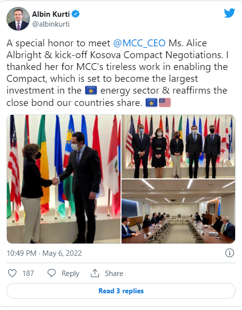 A special honor to meet @MCC_CEO Ms. Alice Albright & kick-off Kosova Compact Negotiations. I thanked her for MCC’s tireless work in enabling the Compact, which is set to become the largest investment in the ?? energy sector & reaffirms the close bond our countries share. ???? pic.twitter.com/rDSI1yxI5n