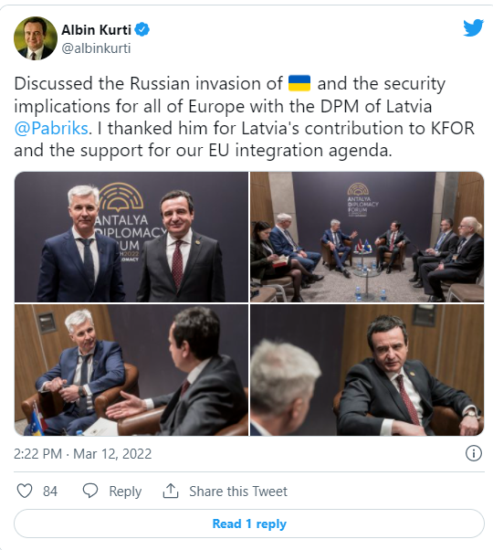Discussed the Russian invasion of ?? and the security implications for all of Europe with the DPM of Latvia @Pabriks. I thanked him for Latvia’s contribution to KFOR and the support for our EU integration agenda. pic.twitter.com/Pnt0BXQfd9