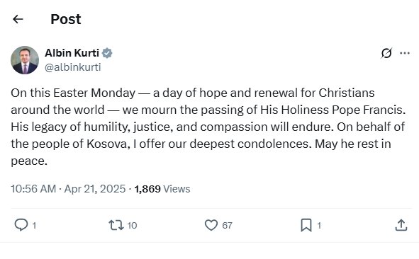 “Në këtë të hënë të Pashkëve – një ditë shprese dhe ripërtëritjeje për të krishterët në mbarë botën – ne vajtojmë vdekjen e Shenjtërisë së Tij Papa Françeskut. Trashëgimia e tij e përulësisë, drejtësisë dhe dhembshurisë do të vazhdojë. Në emër të popullit të Kosovës, shpreh ngushëllimet tona më të thella. U preftë në paqe”, ka shkruar Kurti./Arbresh.info