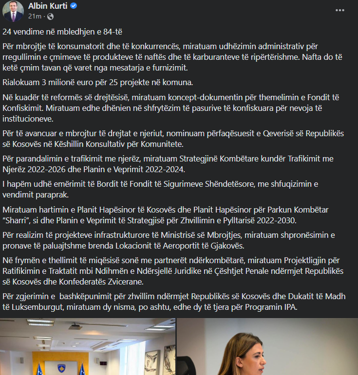 “24 vendime në mbledhjen e 84-të. Për mbrojtje të konsumatorit dhe të konkurrencës, miratuam udhëzimin administrativ për rregullimin e çmimeve të produkteve të naftës dhe të karburanteve të ripërtërishme. Nafta do të ketë çmim tavan që varet nga mesatarja e furnizimit. Rialokuam 3 milionë euro për 25 projekte në komuna”, shkruan Kurti.