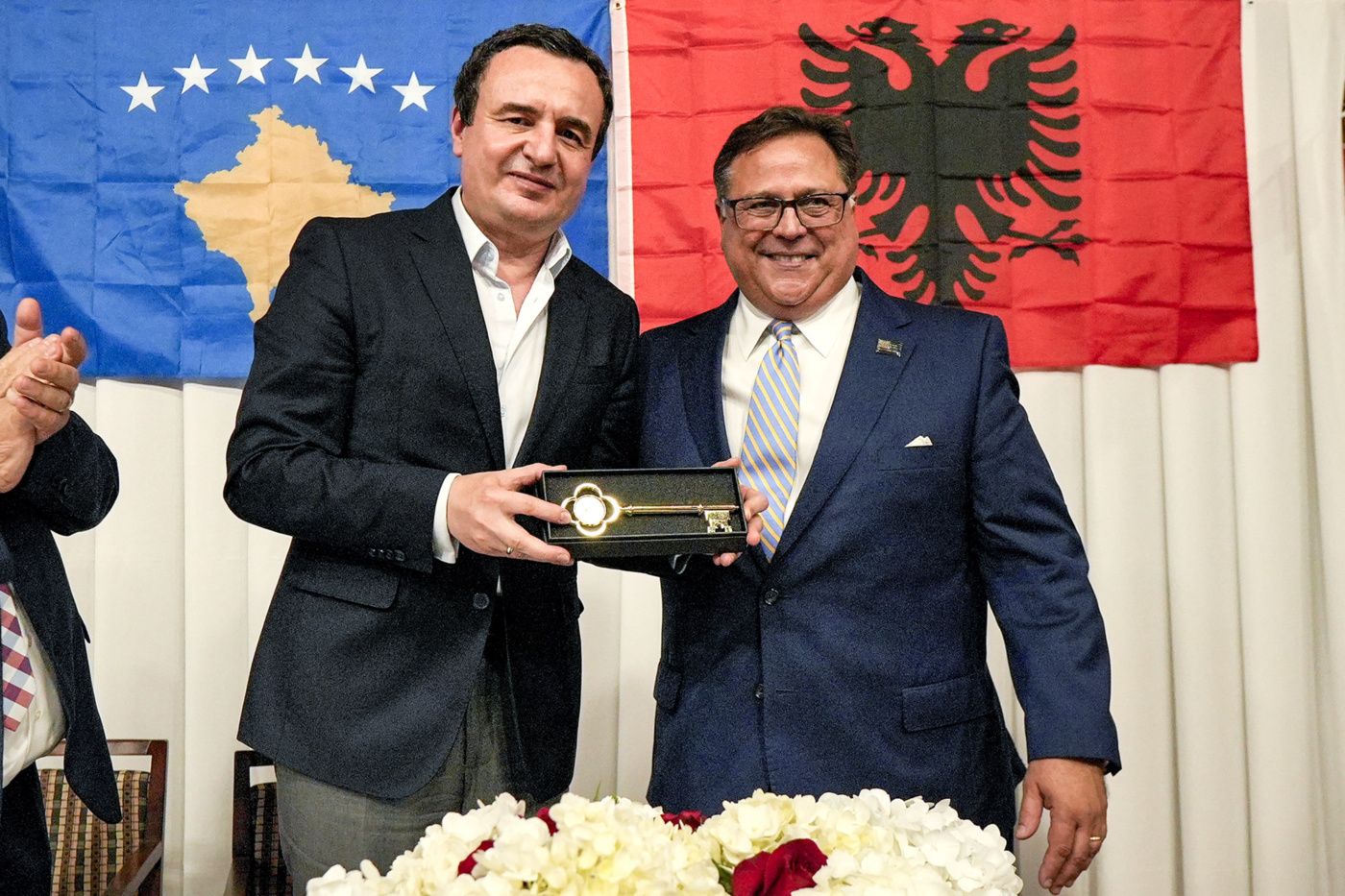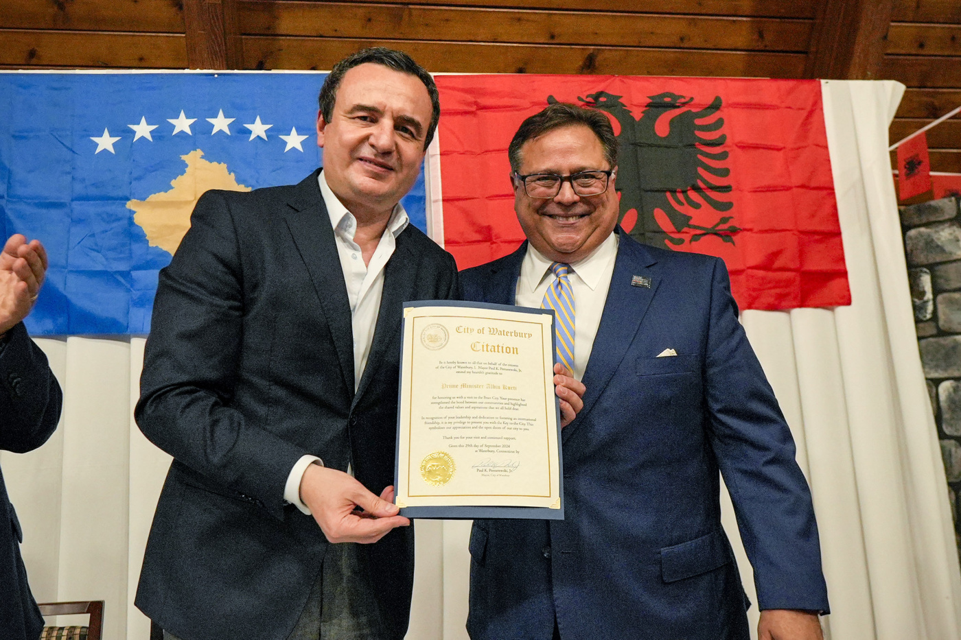 Ndërkaq në fjalën e tij, Kryetari i Qytetit të Ëaterbury, Paul K. Pernereëski Jr., që numëron një komunitet prej 12 mijë shqiptarëve, tha se komuniteti shqiptar në Ëaterbury është ndër më të mëdhenjtë në Amerikë dhe se ata kontribuojnë çmueshëm në jetën shoqërore të qytetit. Ai u shpreh nderuar që sot qyteti po mirëpret kryeministrin Kurti dhe në emër të tij dhe qytetarëve, tha se ka kënaqësi që t’ia dhurojë Çelësin e Qytetit, si vlerësim ndaj udhëheqjes dhe përkushtimit të Kryeministrit për nxitjen e miqësisë ndërkombëtare dhe simbol që dyert të qytetit të Ëaterbury janë gjithmonë të hapura për të.