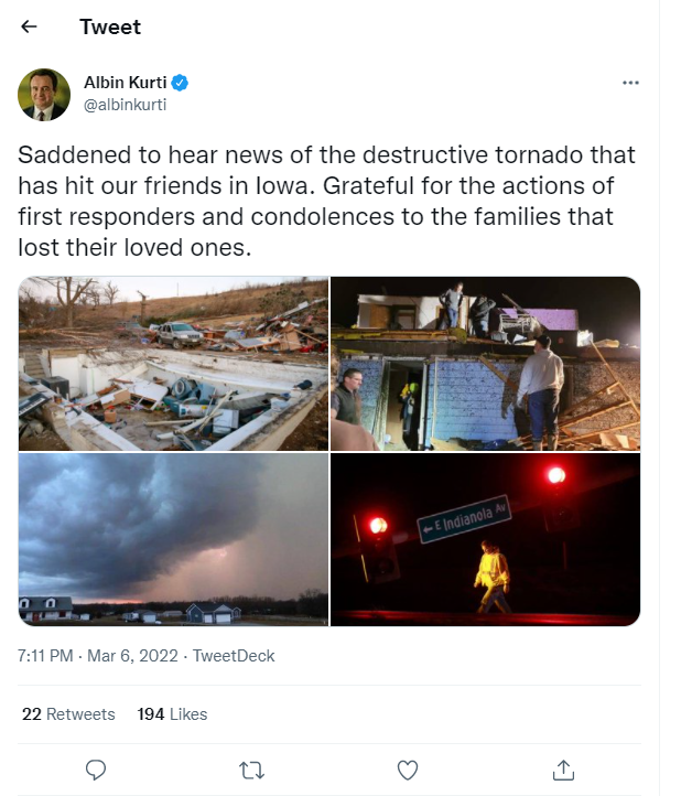 “I pikëlluar kur dëgjova lajmin e tornados shkatërruese që ka goditur miqtë tanë në Iowa. Mirënjohës për veprimet e reaguesve të parë dhe ngushëllime për familjet që humbën të dashurit e tyre”, ka shkruar Kurti në Twitter.