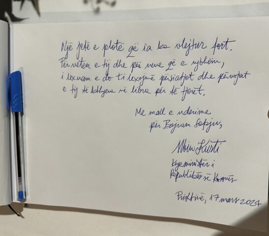 “Një jetë e plotë që ia ka vlejtur fort. Për veten e tij dhe për neve që e njohëm, i lexuam e do t’i lexojmë përsiatjet dhe përvojat e tij të kthyera në libra për të tjerët. Me mall e nderime për Bajram Sefajn”, shkroi kryeministri Kurti, në librin e ngushëllimeve./Arbresh.info/