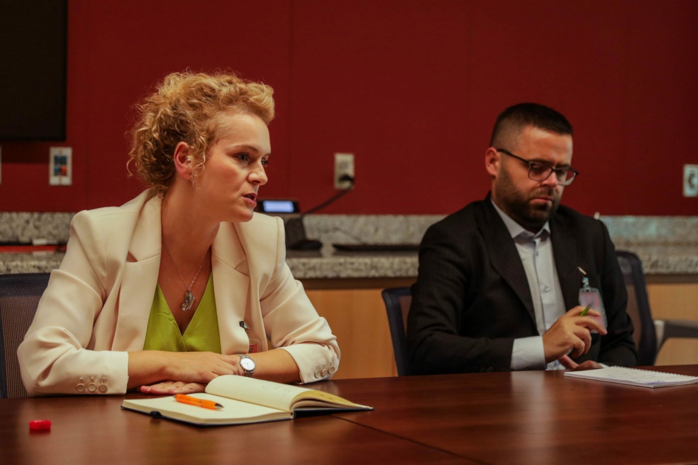Kryetari i Bordit të Asociacionit të Gazetarëve të Kosovës, Xhemajl Rexha, dhe juristja e medias, Flutura Kusari mbajnë konferencë për media.